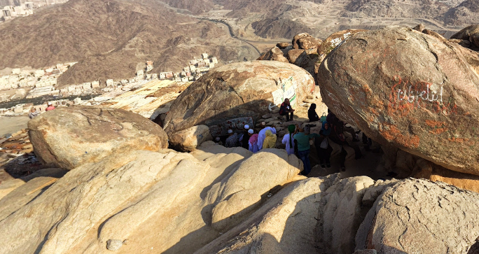 - The Prophet ﷺ would often stay in this cave. It was where Angel Jibreel came & asked the Prophet ﷺ to recite the 1st verse in Surah Al-Alaq, the Prophet ﷺ replied I cannot read. Jibreel then recited the next 4 verses of Surah Alaq. The Prophet ﷺ was 40 years old when this happened. A'isha, the wife of the Messenger of Allah (ﷺ), reported: The first (form) with which was started the revelation to the Messenger of Allah was the true vision in sleep. And he did not see any vision but it came like the bright gleam of dawn. Thenceforth solitude became dear to him and he used to seclude himself in the cave of Hira', where he would engage in tahannuth (and that is a worship for a number of nights) before returning to his family and getting provisions again for this purpose. He would then return to Khadija and take provisions for a like period, till Truth came upon him while he was in the cave of Hira'. There came to him the angel and said: Recite, to which he replied: I am not lettered. He took hold of me [the Apostle said] and pressed me, till I was hard pressed; thereafter he let me off and said: Recite. I said: I am not lettered. He then again took hold of me and pressed me for the second time till I was hard pressed and then let me off and said: Recite, to which I replied: I am not lettered. He took hold of me and pressed me for the third time, till I was hard pressed and then let me go and said: Recite in the name of your Lord Who created, created man from a clot of blood. Recite. And your most bountiful Lord is He Who taught the use of pen, taught man what he knew not (al-Qur'an, Al-Alaq 1-4)...... [Sahih Muslim 1/308 (Hadith shortened)